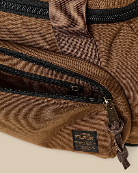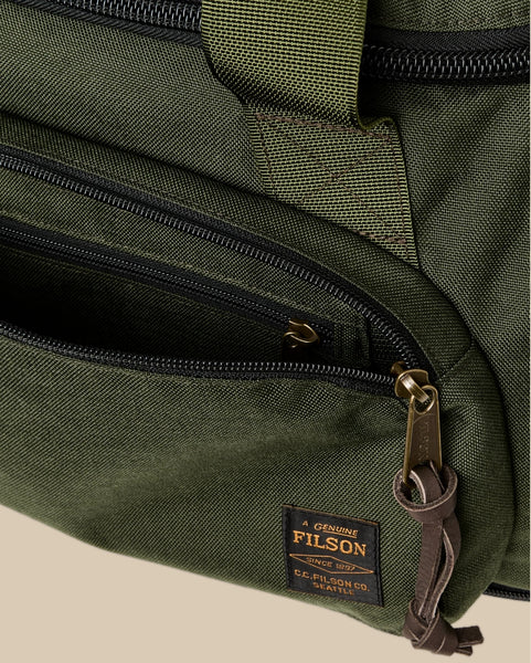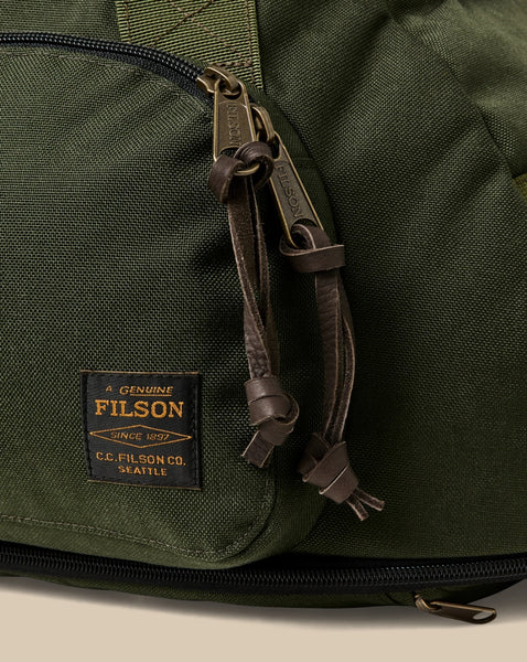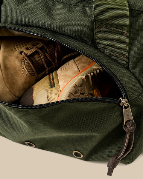 Nylon-webbing handles are equipped with a carry grip built with vegetable-tanned Bridle Leather from Pennsylvania’s iconic Wickett & Craig tannery for carrying comfort that will last a lifetime. The 2”-wide nylon-webbing shoulder strap is adjustable, removable and extremely sturdy. For maximum versatility, the rear sports padded, adjustable shoulder straps for backpack-style carry that stow out of the way in their own dedicated sleeve–we really did think of everything when we engineered this duffle.